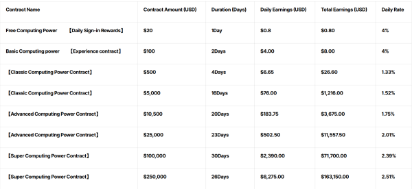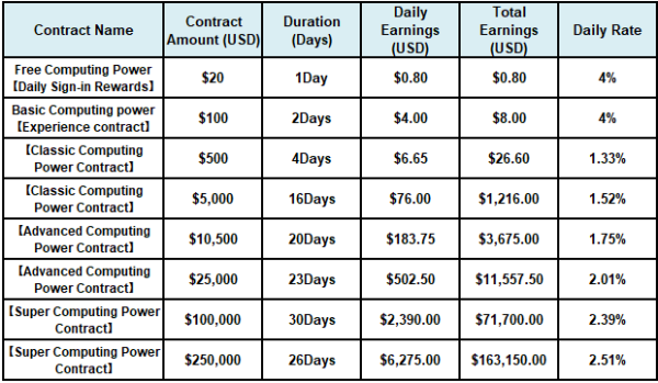 FY Energy offers some of the most attractive contracts in the cloud mining industry with daily profits of up to $16,000+. Better yet, it provides a $20 free computing power with $0.8 daily returns.