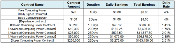 Deposit using BTC, ETH, LTC, XRP, SOL, or any other supported coin. A new Free Computing Power contract can be activated even with a deposit of $20 to get you started.