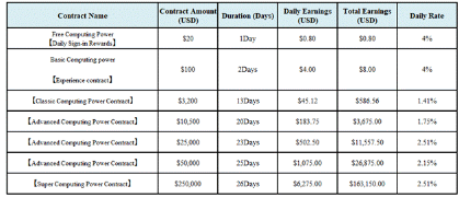 Check out the different available plans and select one that reflects your objectives. Whether it is the $100 Basic Computing Power contract or the $100,000 Elite plan, the activation of contracts is done on the spot and the payouts are within 24 hours — no waiting, no hardware setup, and no extra fees.